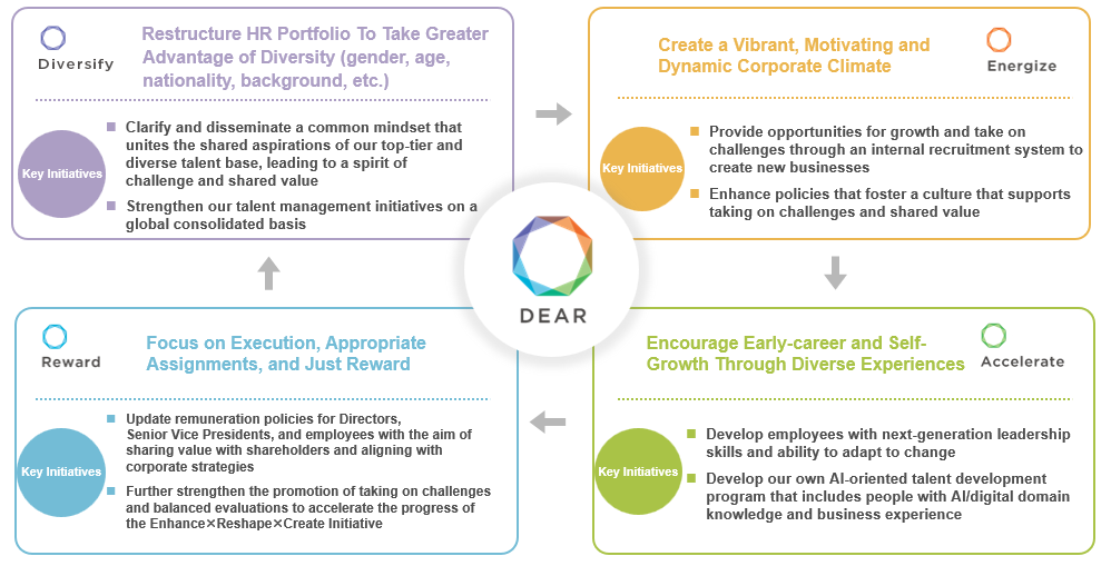 To that end, we are implementing concrete measures, such as aiming for more than 30 percent female representation at all levels and identifying and developing talent capable of taking on roles that are both highly important and highly demanding.