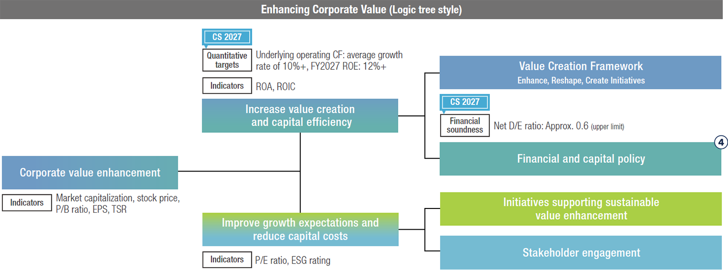 We also continued to emphasize quantitative management indicators focused on growth and efficiency, core priorities for us. However, several elements of these indicators reflect my own perspectives. Traditionally, we have used net income as a growth metric. For CS 2027, we shifted to cash flow from business activities, which excludes asset and business sales or one-time items, and decided to evaluate its average growth rate. This change reflects our belief that stable, recurring CF is a more accurate measure of our capacity for sustainable investments and shareholder returns. Its consistent growth is directly tied to shareholder expectations and the enhancement of our corporate value.