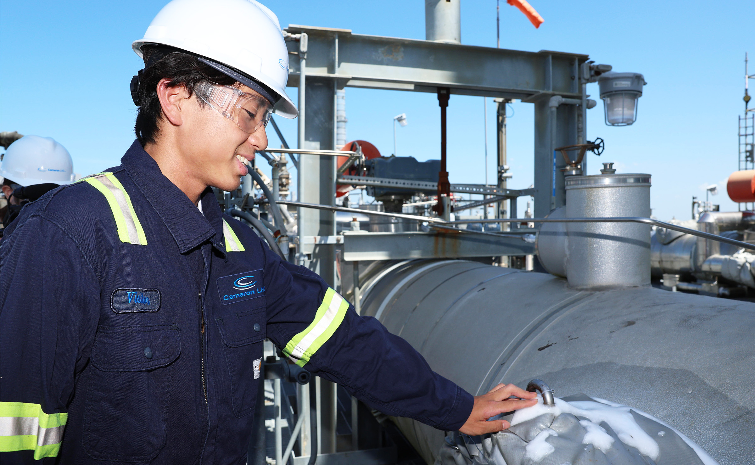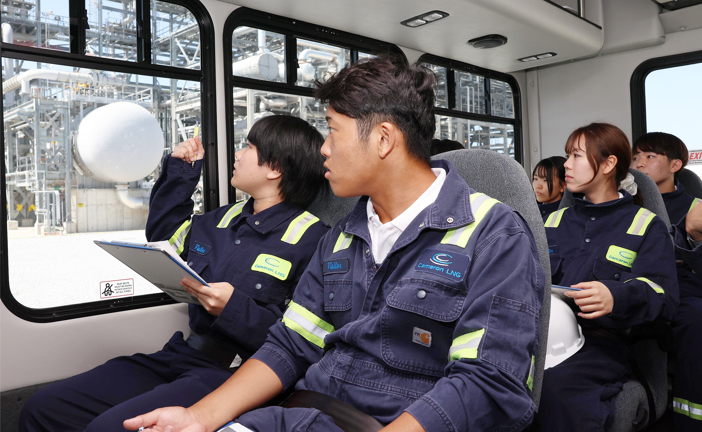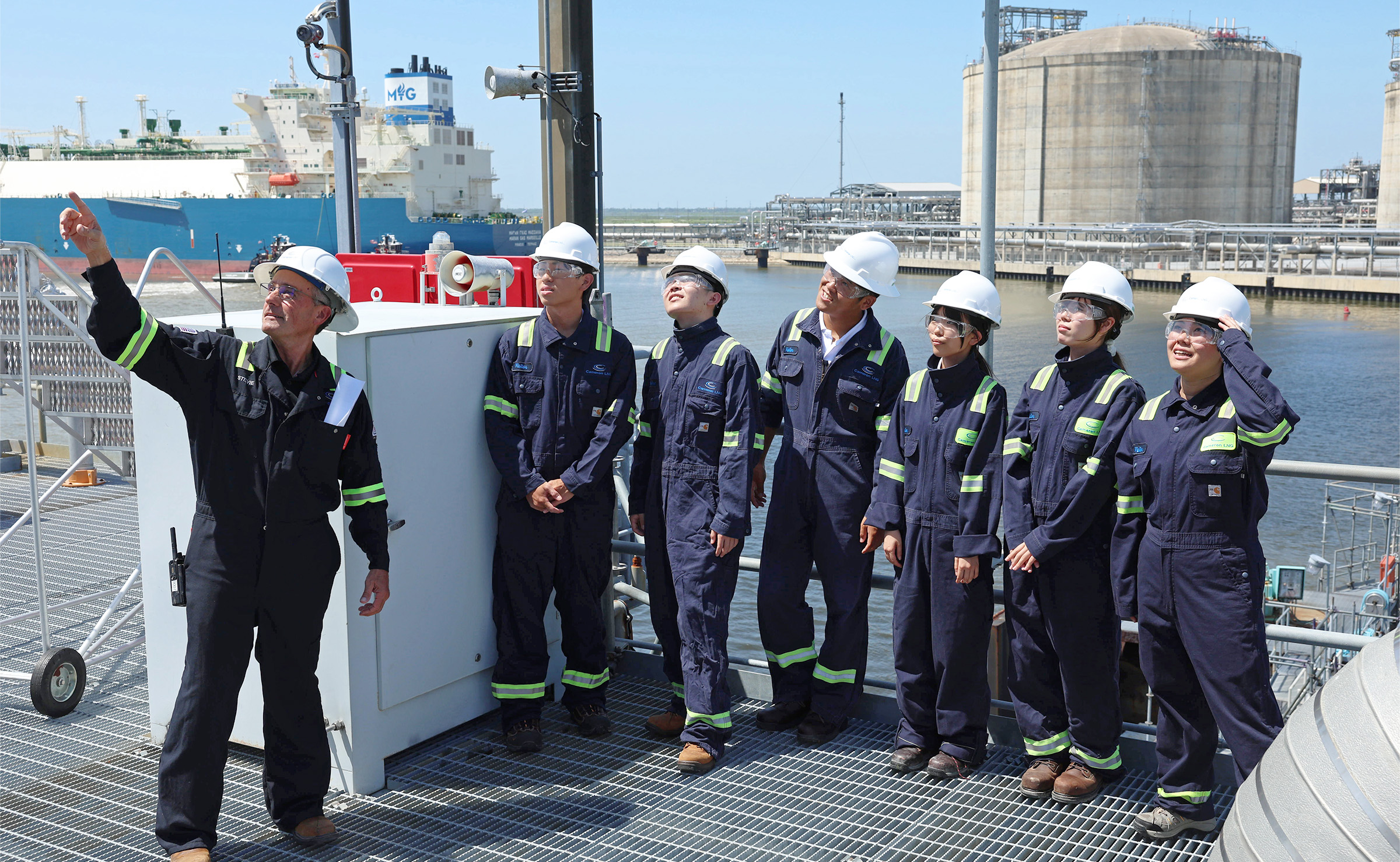 The group visited the Cameron LNG plant in Hackberry, Louisiana, observing facilities used to liquefy natural gas and transport it by tanker. They learned about LNG production mechanisms and witnessed firsthand the scale and significance of the project.