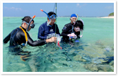 The Okinawa research and volunteer program for 2009 was held this September at the Sesoko Station Tropical Biosphere Research Center of the University of the Ryukyus in Okinawa. Eleven volunteers, including seven MC staff, supported research activities that included collecting information on not only coral reefs, but also on various plants and other marine life. The data collected from the field was then recorded and analyzed back at the research station. Researchers also gave the volunteers lectures on various topics related to corals and as well as their individual research efforts.