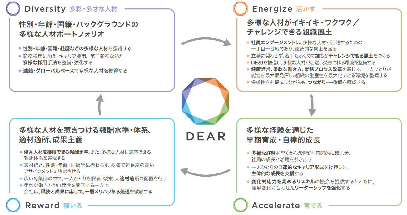吉木三菱商事ではいま、10年後を見据えた「MC HR Vision『DEAR』」を掲げ、取り組みを進めています。DEARとは、Diversity(多彩・多才な人材)、Energize(活かす)、Accelerate(育てる)、Reward(報いる)の頭文字をとったもの。性別や国籍、経歴などが多様な人材を獲得し、誰もがイキイキ・ワクワクとチャレンジしながら働ける環境を作り、成長を実感してもらえるように。そして社員の成長を会社の発展につなげていけるように、というビジョンです。